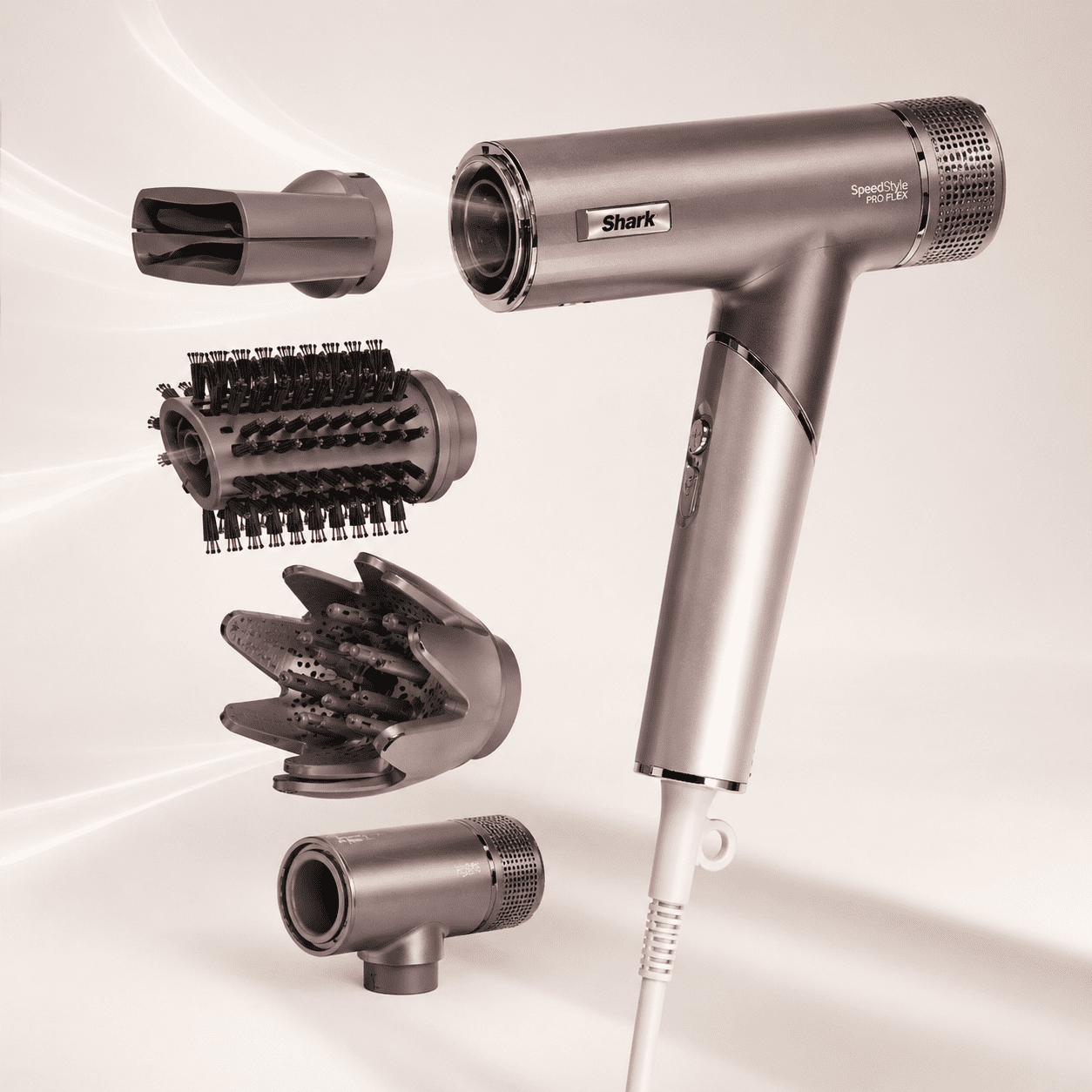 Meet the Shark SpeedStyle Pro FLEX Hair Dryer System. Designed for high performance in a compact design that flexes for easy storage, without compromising power. Includes Scalp Shield — designed to protect new hair growth from extreme heat.